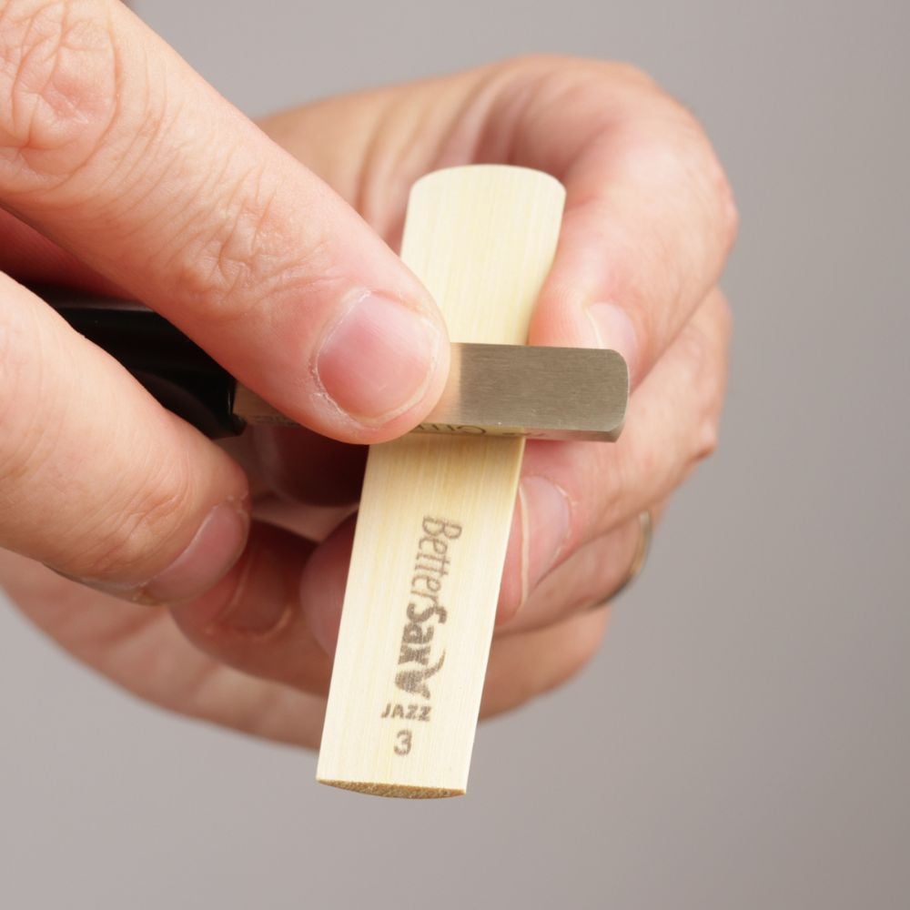 - Flatten the table. In a matter of seconds you can make any reed table perfectly flat. Reeds are made of wood and there will always be some level of warpage each time they get wet then dry. When the reed table is warped, it won’t seal as well with the mouthpiece resulting in sub-optimal performance. We have all experienced what this feels like, and either you just play on a dead sounding reed or you chuck it and use a new one. This simple adjustment will extend the life of every single reed significantly, and greatly improve it’s performance. Flat reed table + flat mouthpiece table = optimal playing conditions.