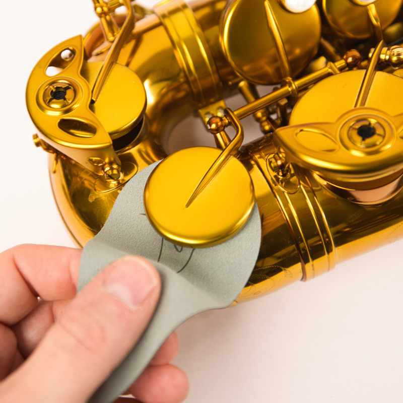 The large swab takes care of the main body tube. Pass the weighted end through the bell and out the neck tenon receiver. Pull the swab through 3 times or until it’s dry inside. The smaller swab takes care of the neck and mouthpiece. Same procedure, pass the weight through the larger hole and out the smaller end then pull it through until dry inside. The pad dryer can be used to absorb moisture on the pads. Check pads from G and above on your instrument. These are usually the ones getting wet. You may also want to check low Eb and C#. Close the pad dryer between the pad and the tone hole and gently pull out. This will remove moisture and clean off the surface of the pad and tone hole gently.